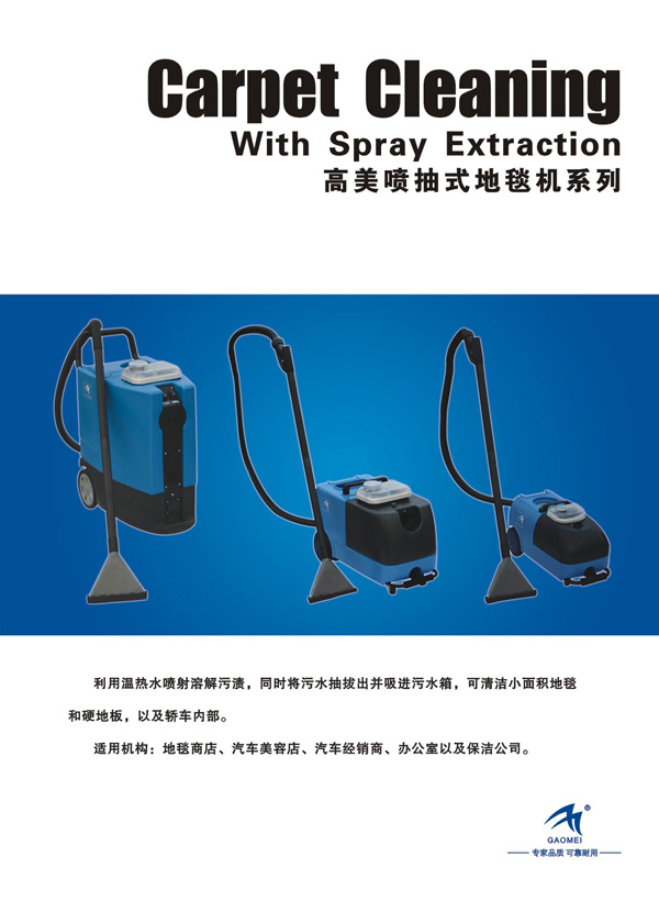The use of hot water spray stain dissolved, while sewage pumping pull out and sucked into the sewage tank, to clean up the small area rugs, as well as inside cars; suitable for medium-term maintenance of the use of the carpet. For institutions: carpet stores, car beauty shops, auto dealers, office, and Procter & Gamble. Characteristics: 1, jet pump, combo, dry fast. 2, waste water tank with handle, made to facilitate dumping. 3, large tail wheel equipped with pull-rod design, convenient transfer support. 4, durable polyethylene material.